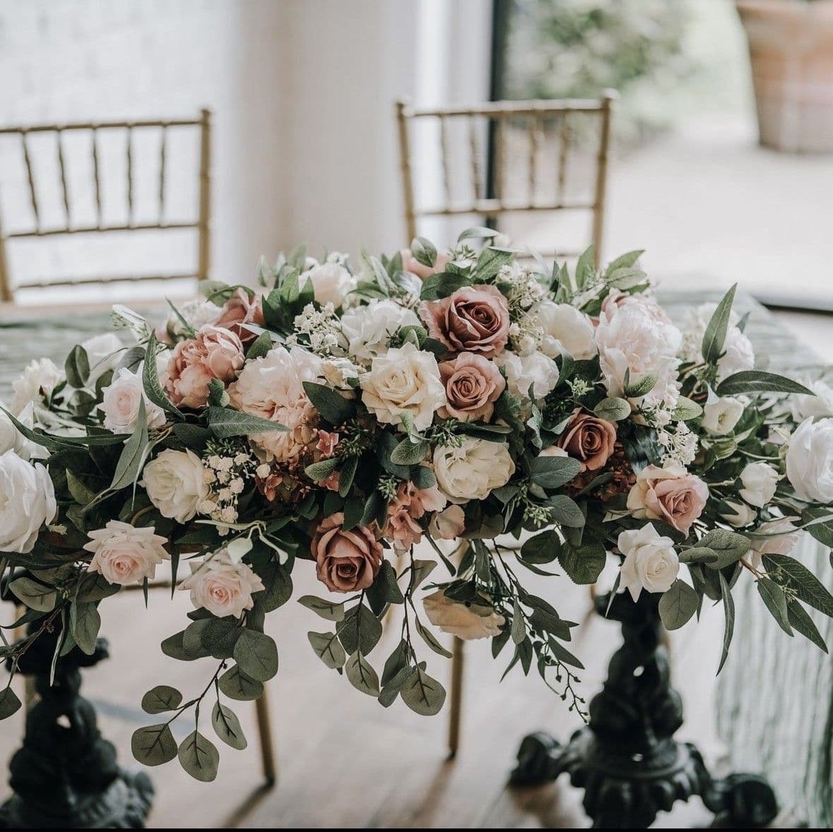Long and Low Top Table Arrangements spanning 2ft or 3ft mirror the flowers of the arch arrangement. Explore the Long and Low Arrangement section for style inspiration.