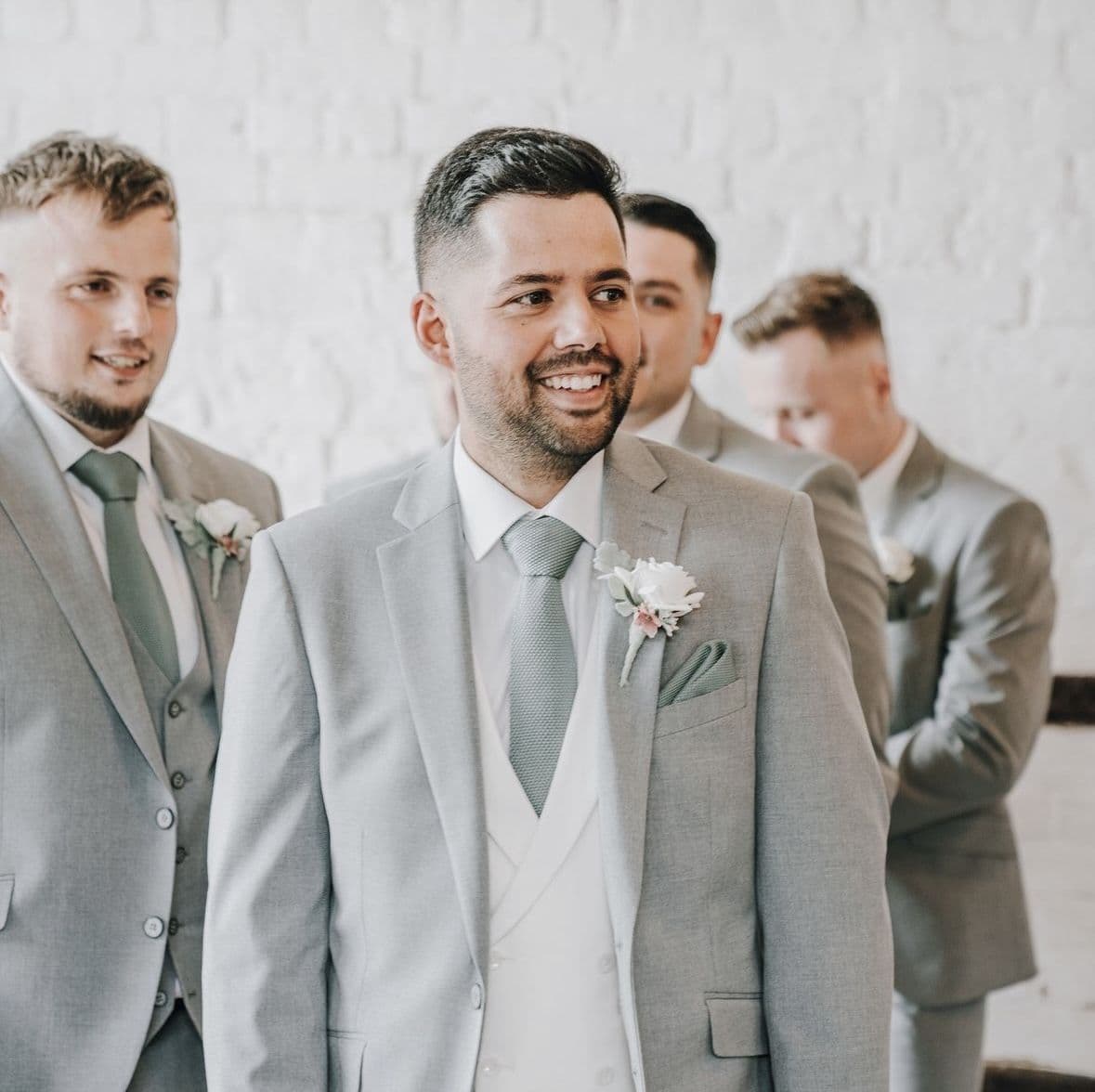 Page Boy Buttonholes showcase a smaller real-touch rose, filler flower, and foliage secured with ivory ribbon on a magnet.