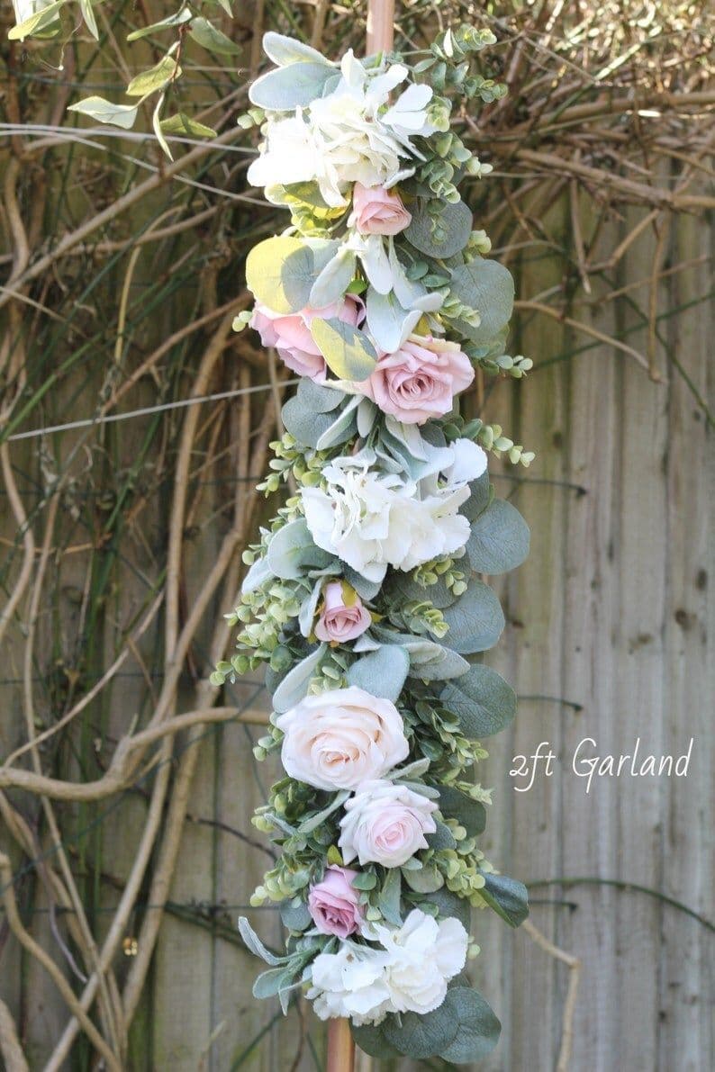 The 6ft Garland features eucalyptus and mixed roses. For smaller sizes, refer to the Ebony Garland section.