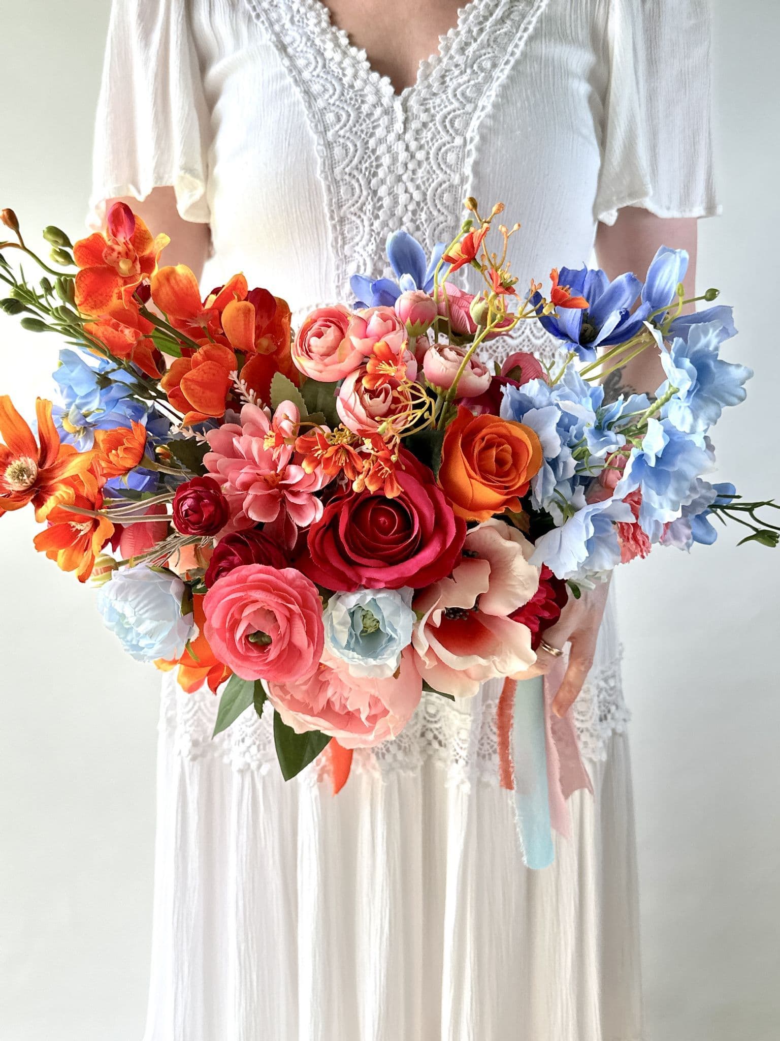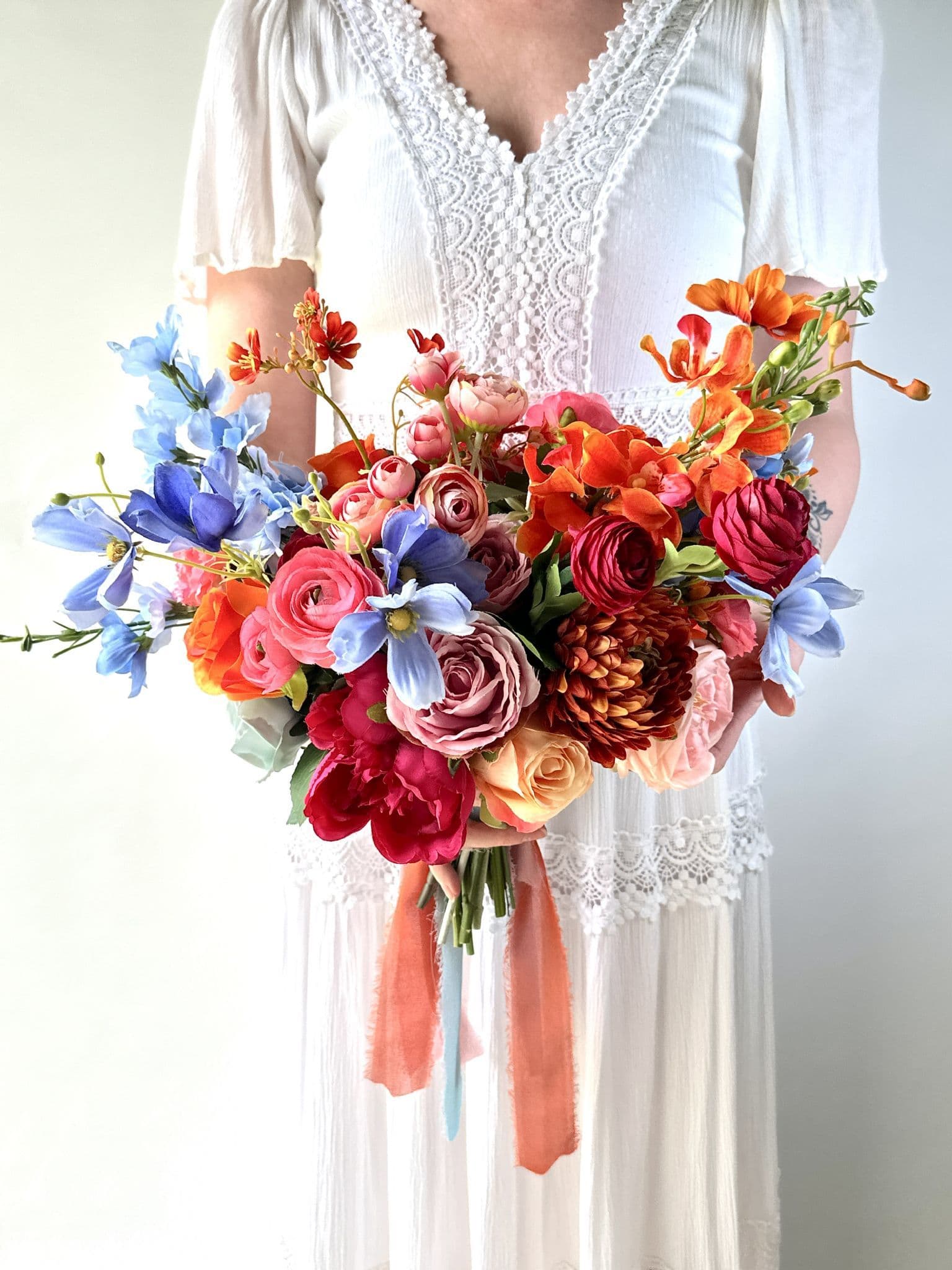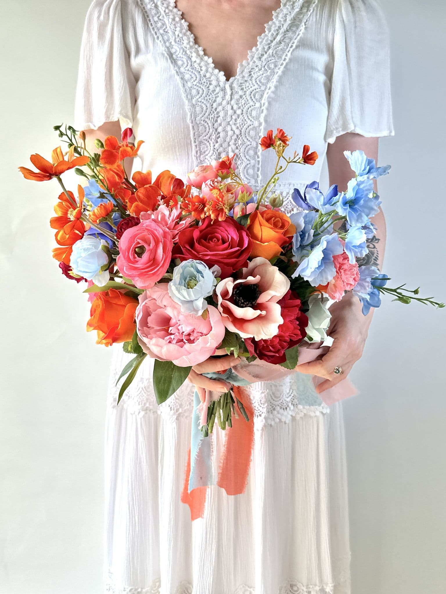 Make a bold statement with this vibrant hot pink, blue and orange wedding bouquet. Designed for modern, fun-loving brides, this bouquet features high-quality faux flowers, including mixed roses, peonies, ranunculus, chrysanthemum, cosmos and orchid.