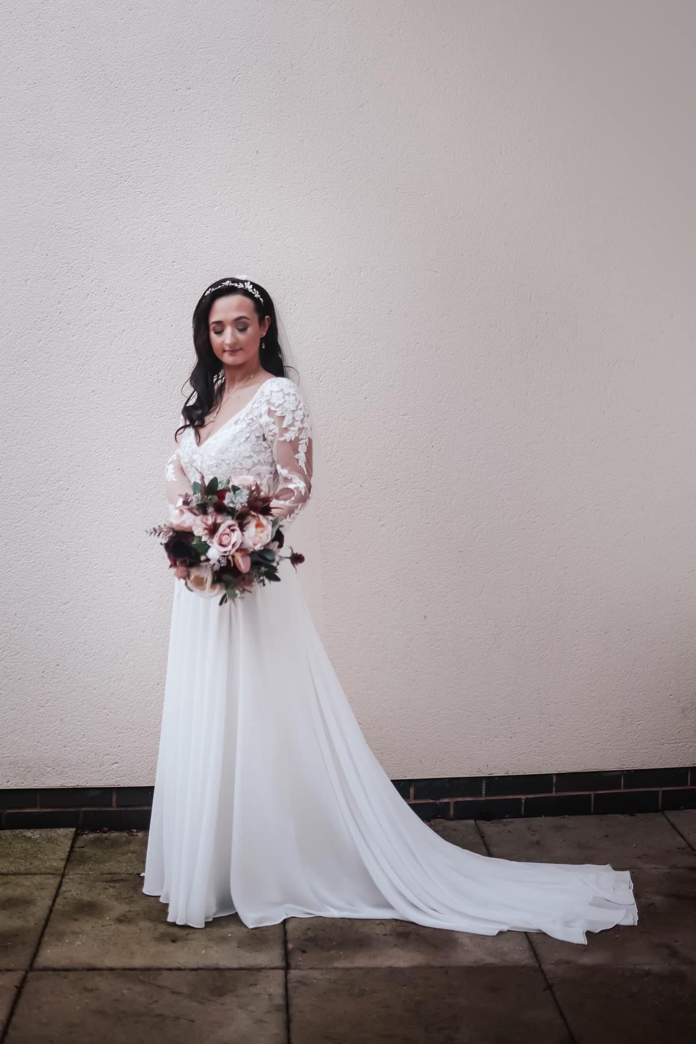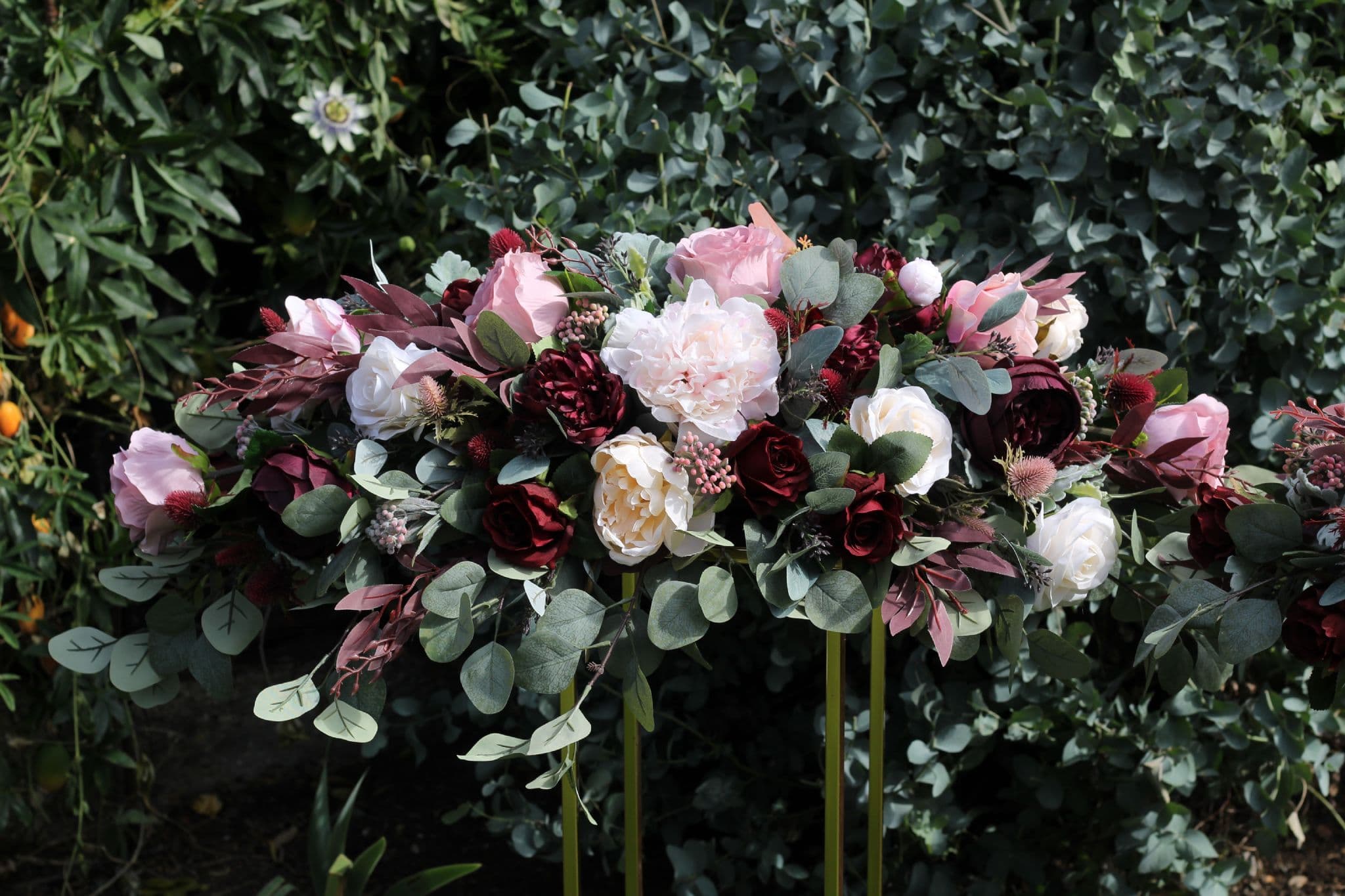The Hera Blush & Burgundy Artificial Bridal Bouquet is a romantic, richly textured cascading design, perfect for brides seeking a luxurious mix of blush, burgundy, and ivory silk wedding flowers. Expertly handcrafted with high-quality faux materials, this bouquet brings together the warmth of deep red tones with the softness of blush for a stunning statement piece.