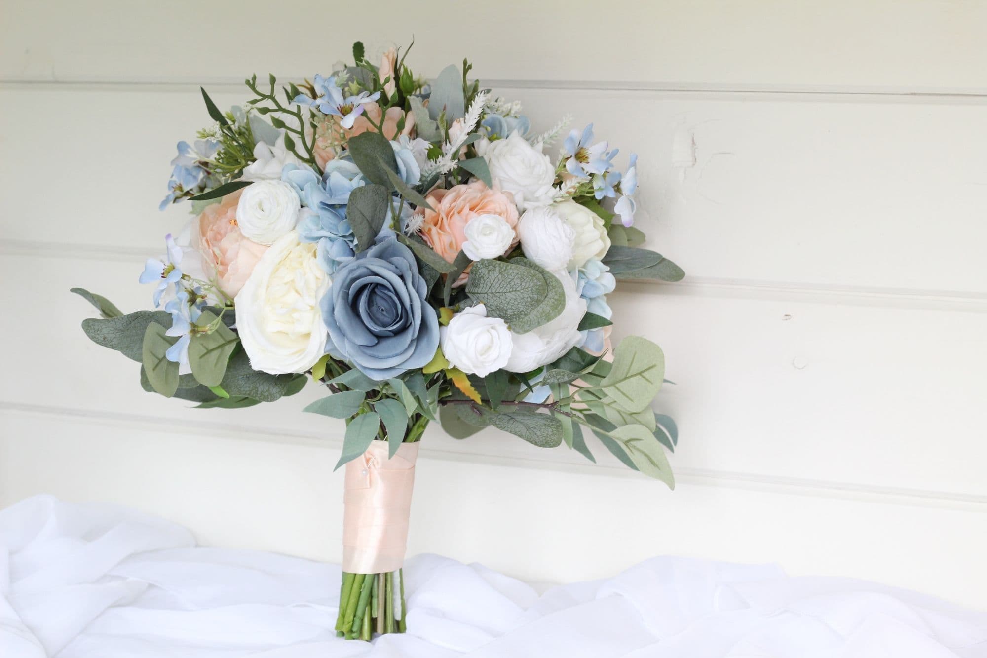Florence Artificial Peach & Dusty Blue Bridal Bouquet – Elegant Faux Wedding Flowers