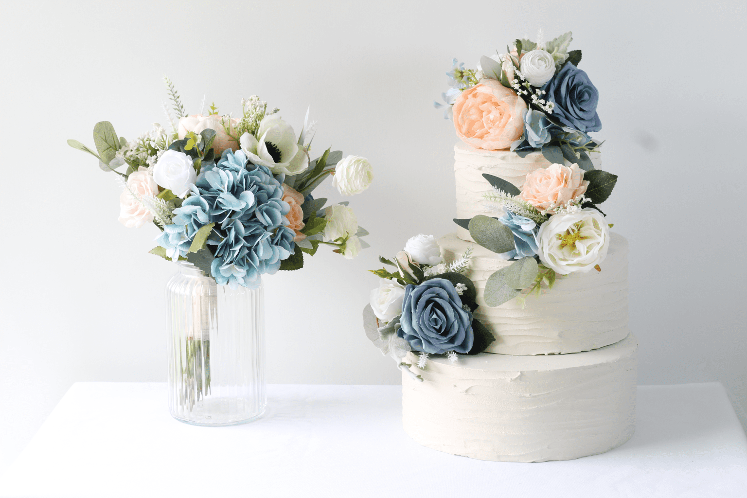 Introducing the “Florence” Collection – a timeless blend of hybrid peach, dusty slate blue, white, and ivory artificial flowers, designed to bring elegance, softness, and romantic charm to your special day.
