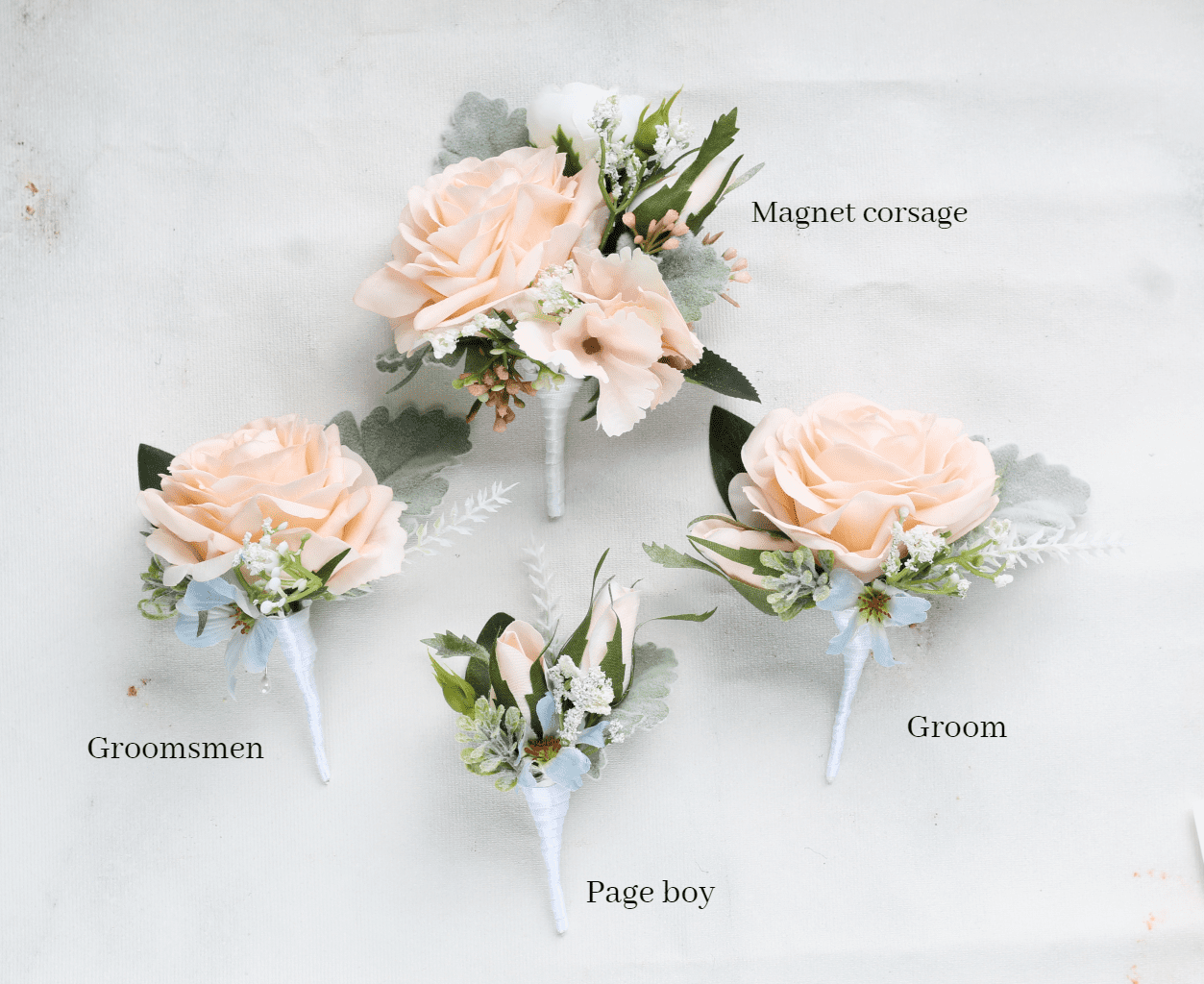 Page boy option: small ivory or peach rosebud with gyp and foliage (magnet back)