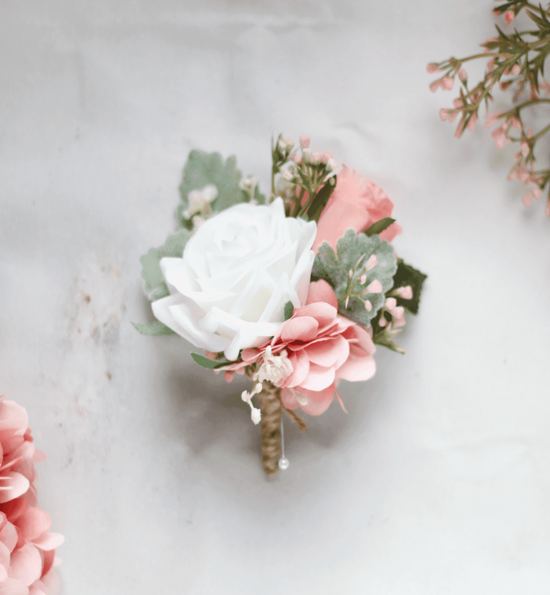 Double real touch white rose, peach hydrangea, tweedia, and foliage