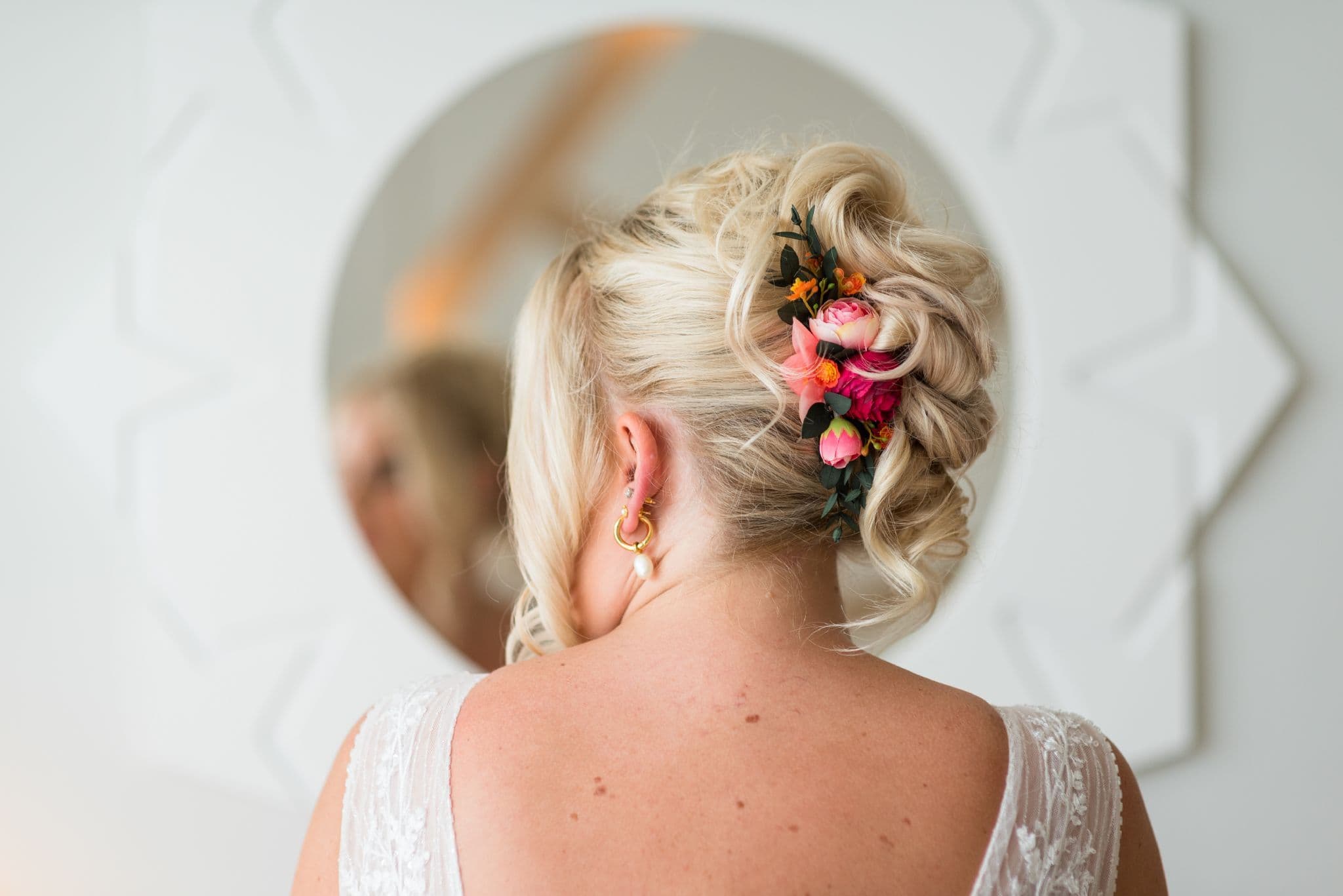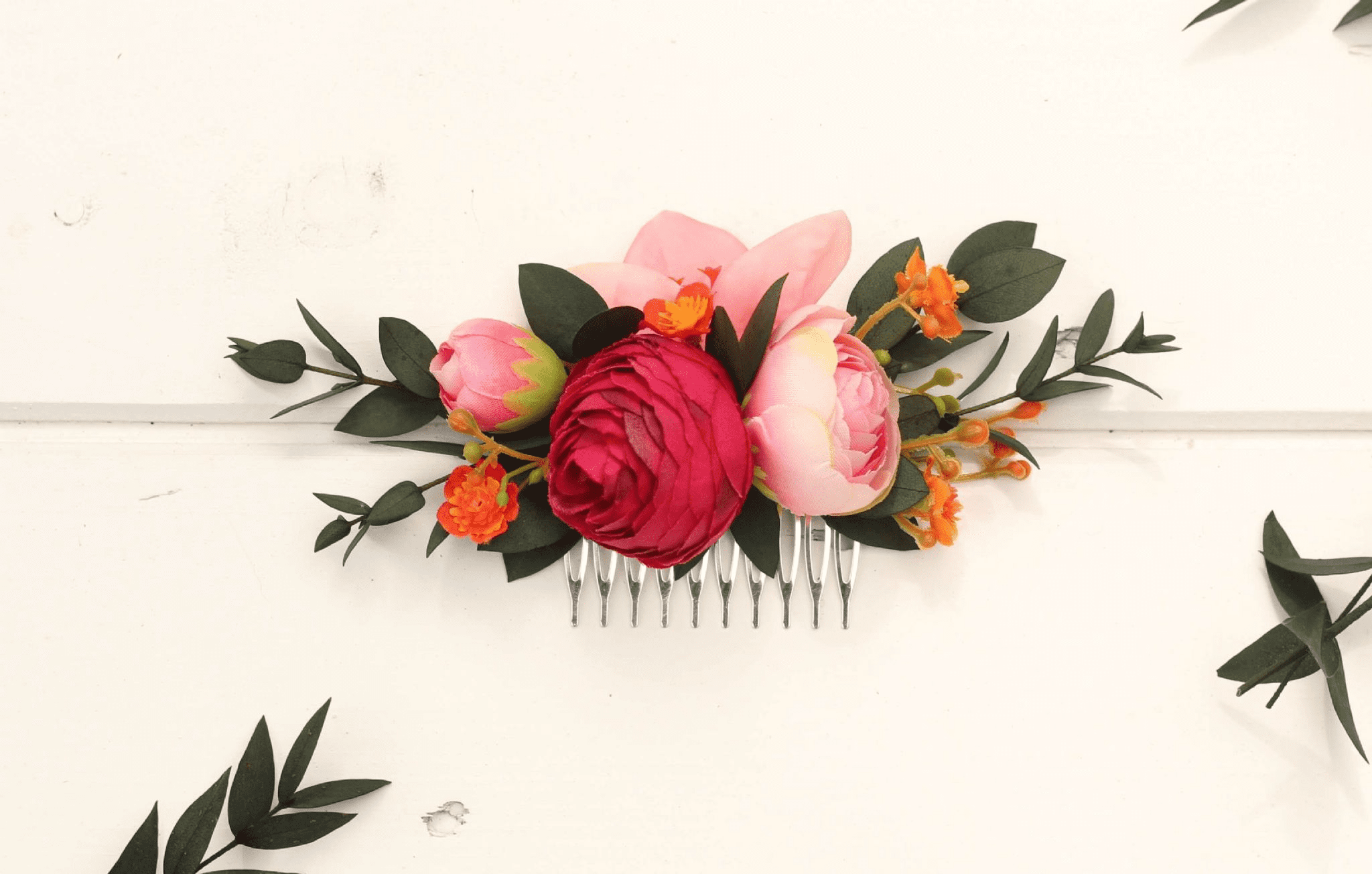 Hair Accessories: Coordinating hair comb or clip with vibrant florals and dried eucalyptus