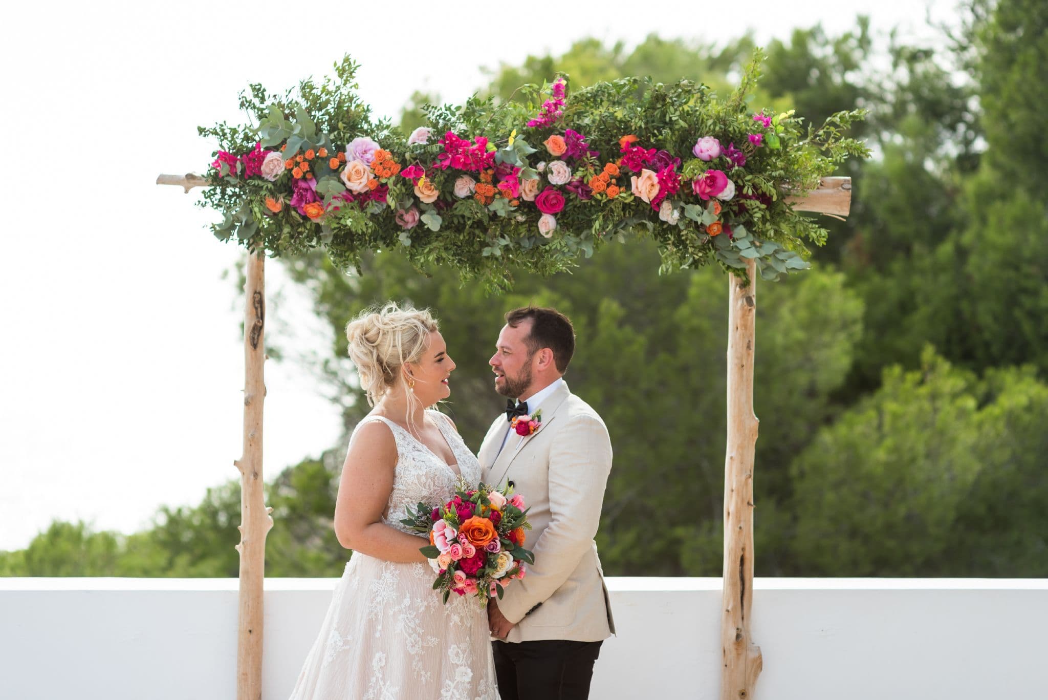 This bold and captivating ensemble features a beautiful mix of faux roses, anemone, peonies, ranunculus, eucalyptus, and ruscus. The colour palette bursts with vivid fuchsia, hot pink, orange, blush peach, and soft pink tones—perfect for summer weddings, tropical celebrations, or bold, modern themes.