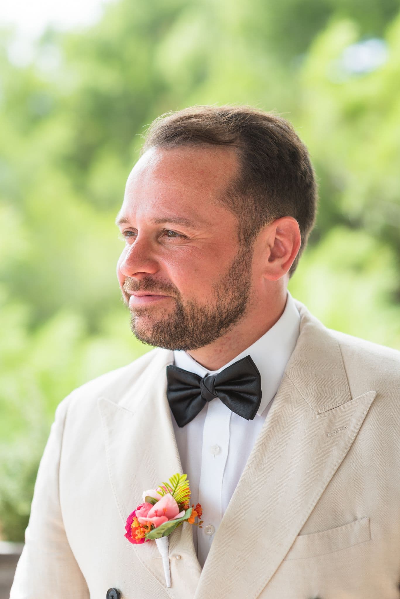 Buttonhole: Ranunculus, bougainvillea, wax flower, and foliage, finished with white ribbon